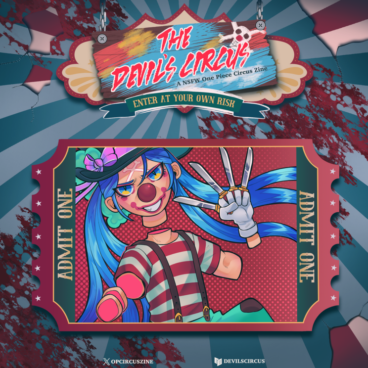 This Adult-only preformance takes place after the original 'Divine Carnival' show! Hosted by the Genius Jester himself, Buggy!A free digital NSFW One Piece Circus Zine showcasing some of our favorite characters in both dangerous and scandalous performances. Grab your ticket and be ready to be bewildered and charmed at The Devil's Circus!Characters featured:Buggy, Rosinante, Mihawk, Crocodile, Perona, Law, Doflamingo, Robin, Bellamy, Zoro, Sanji, Koby, Helmeppo, PrinceGrus, X Drake, Page One, Ulti, Reiju, Shanks, Boa Hancock, Brook, Puggy, Ivankov, Inazuma, Sasaki, and more.THIS ZINE IS NSFW, RATED R18+. This project contains mature themes including but not limited to sex, gore, mind break, fetish content and more. PLEASE MIND THE TAGS.